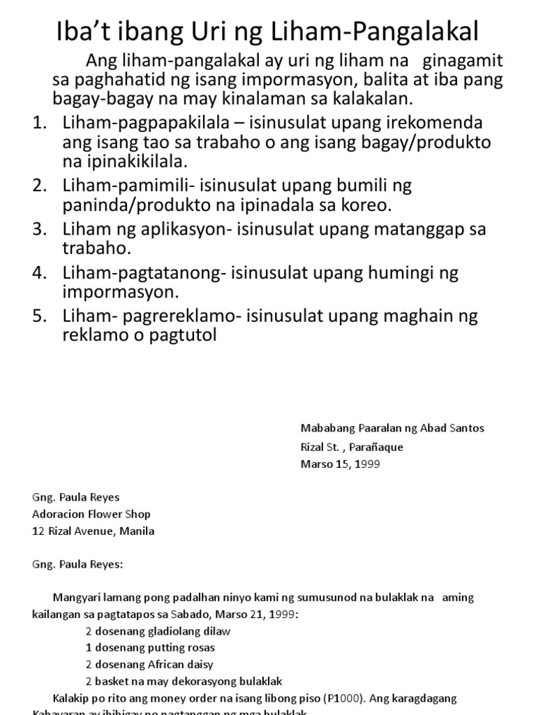 Sa makatwid ito ang adres ng pinadadalahan. Liham ng PagbebentaIto naman ang liham na na ipinadadala sa isang tao o institusiyon nanais bentahan ng isang produkto o serbisyo na tinatawag din itong sales proposal letter. Pagtugon sa mga tanong o paglilinaw 4.