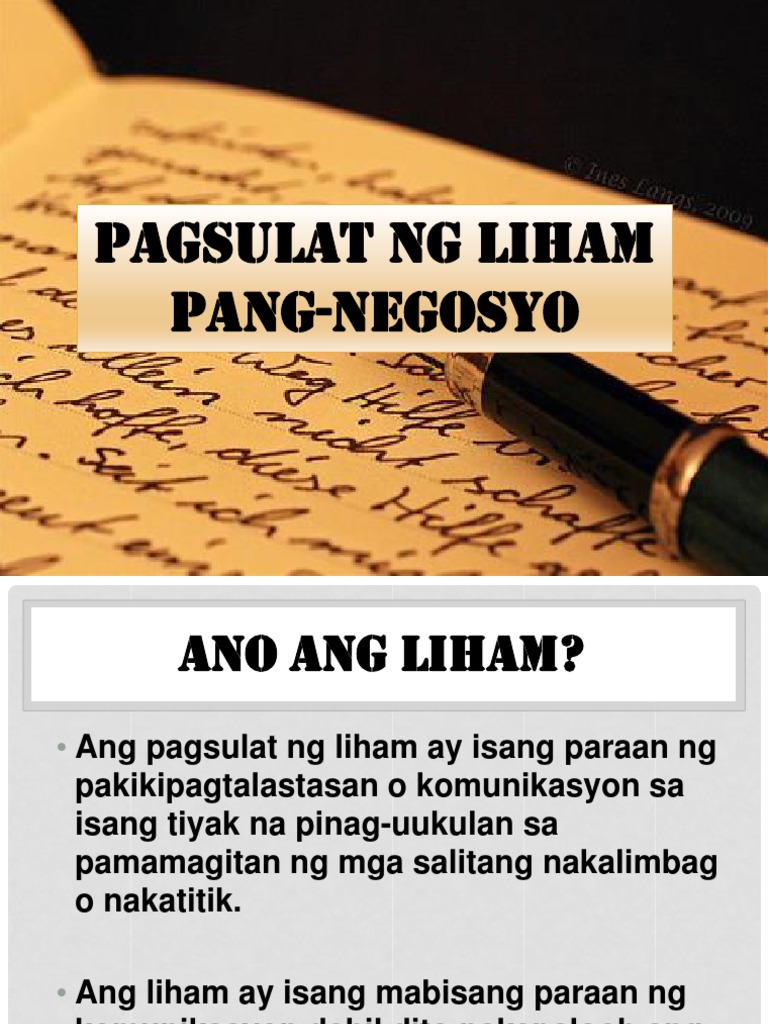 LIHAM PANG NEGOSYO Ito ay isang pormal na sulatin na karaniwang ginagamit sa taong nasa labas ng organisasyon o kompanya. Bahagi ng liham pang negosyo Bahagi ng liham pang negosyo. Bukod dito may nararapat dn na paraan kung paano ito sulatin katulad lamang ng margin na isang pulgado sa bawat gilid ng papel.